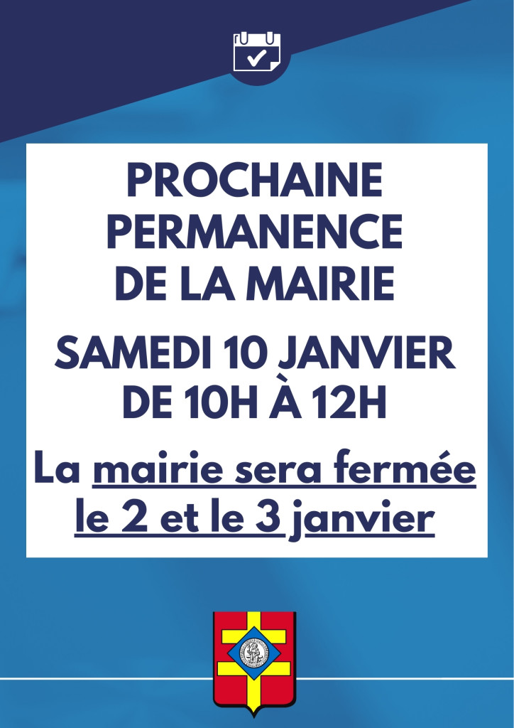 Prochaine permanence de la mairie : samedi 10 janvier, de 10h à 12h.