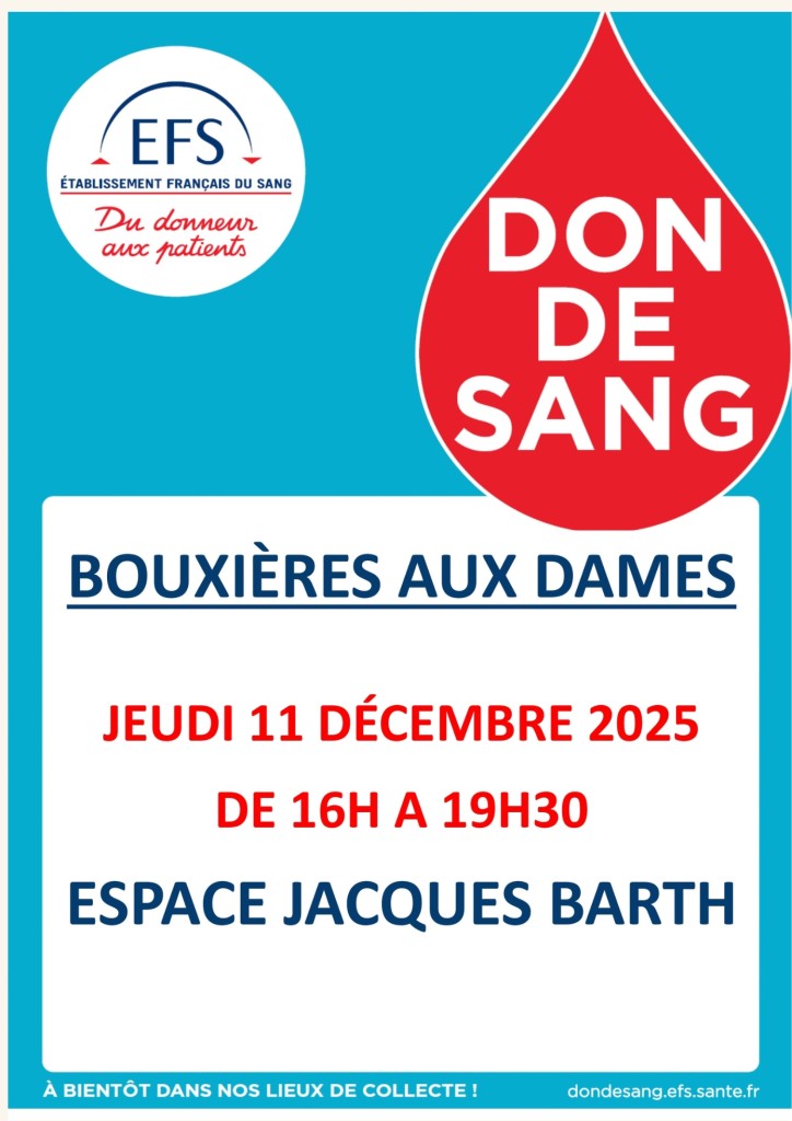 Le don du sang aura lieu jeudi 11 décembre de 16h à 19h30 à l’espace Jacques Barth.